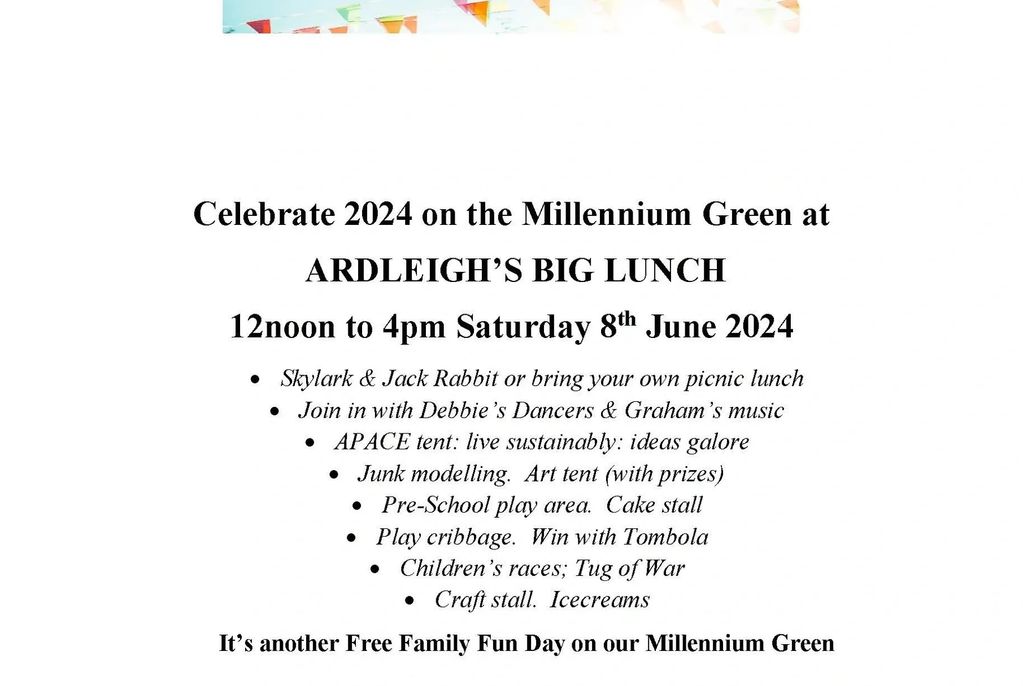 Free Family Fun Day on Ardleigh Millennium Green. Ardleigh's Big Lunch 12noon-4pm Saturday 8 June 2024.
